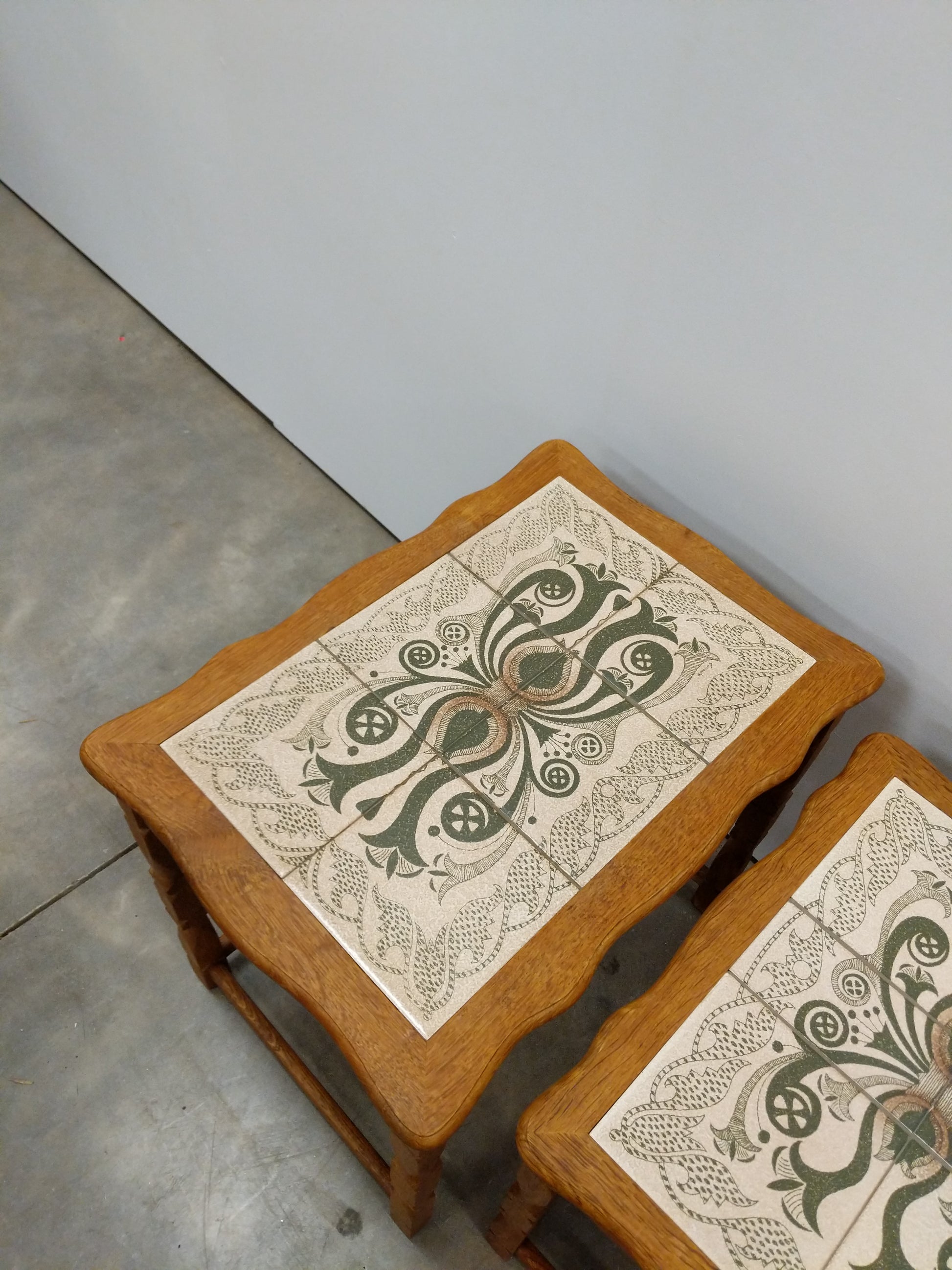 Set of authentic vintage mid century Danish / Scandinavian oak and tile nesting tables.
