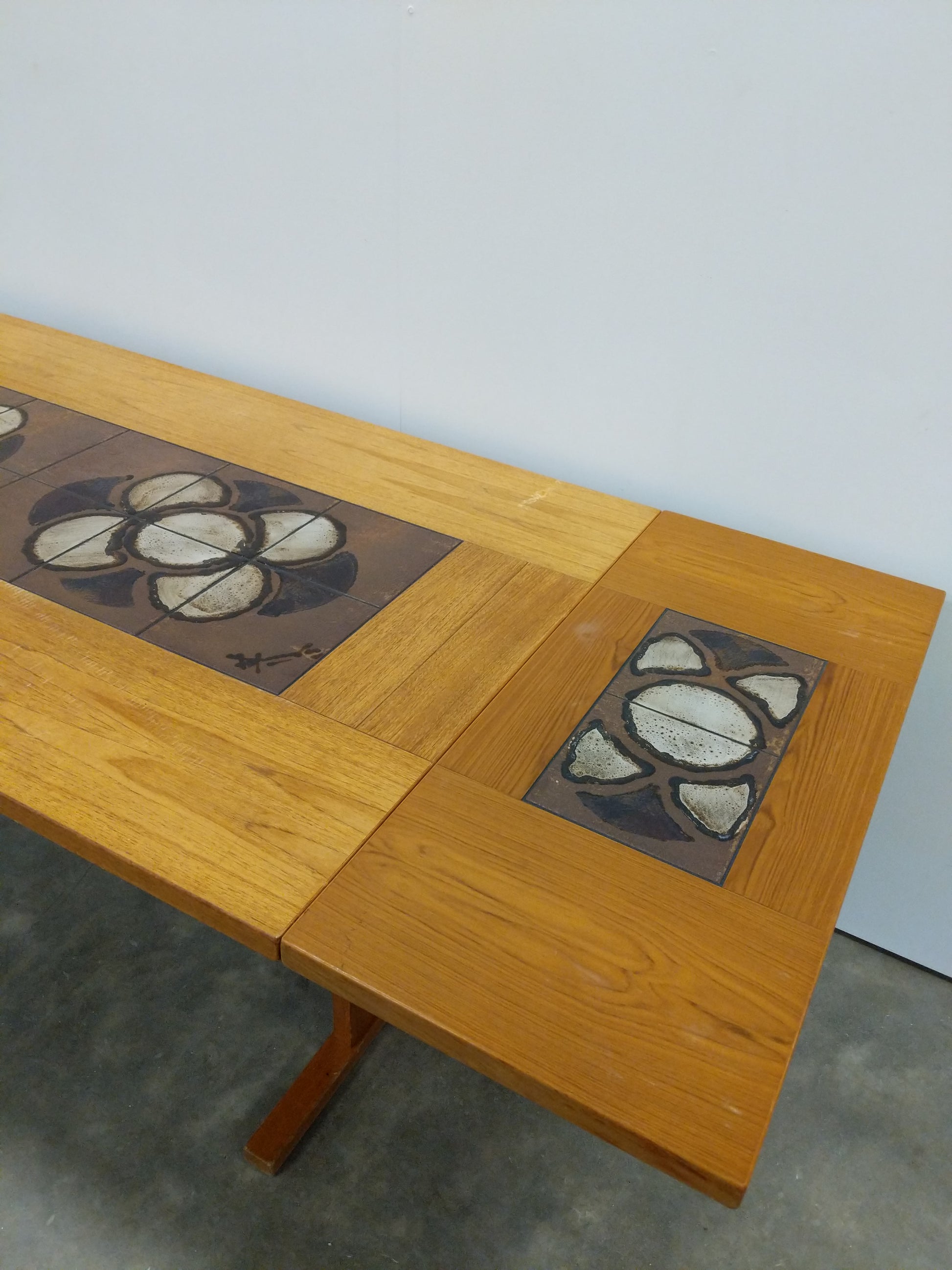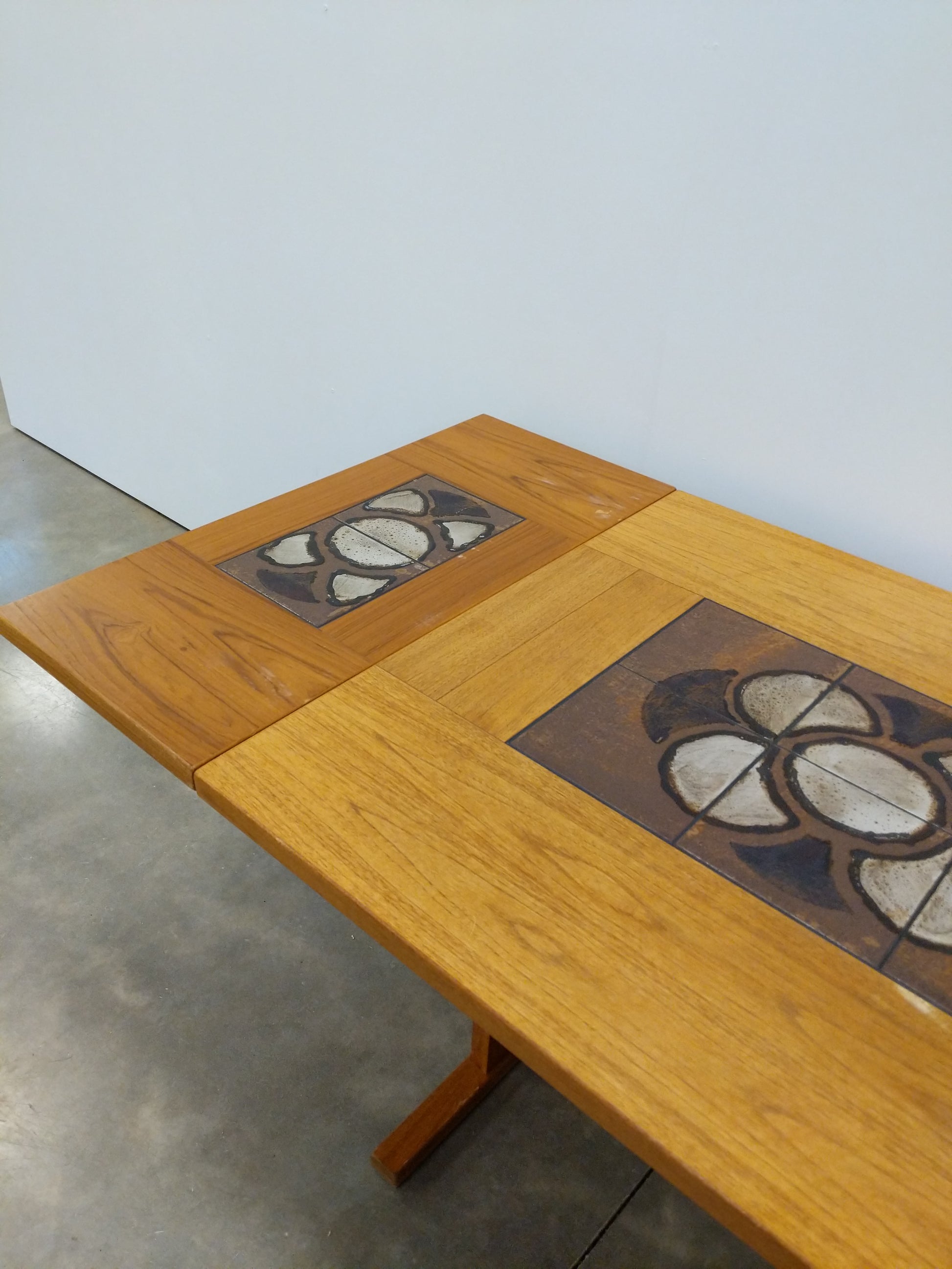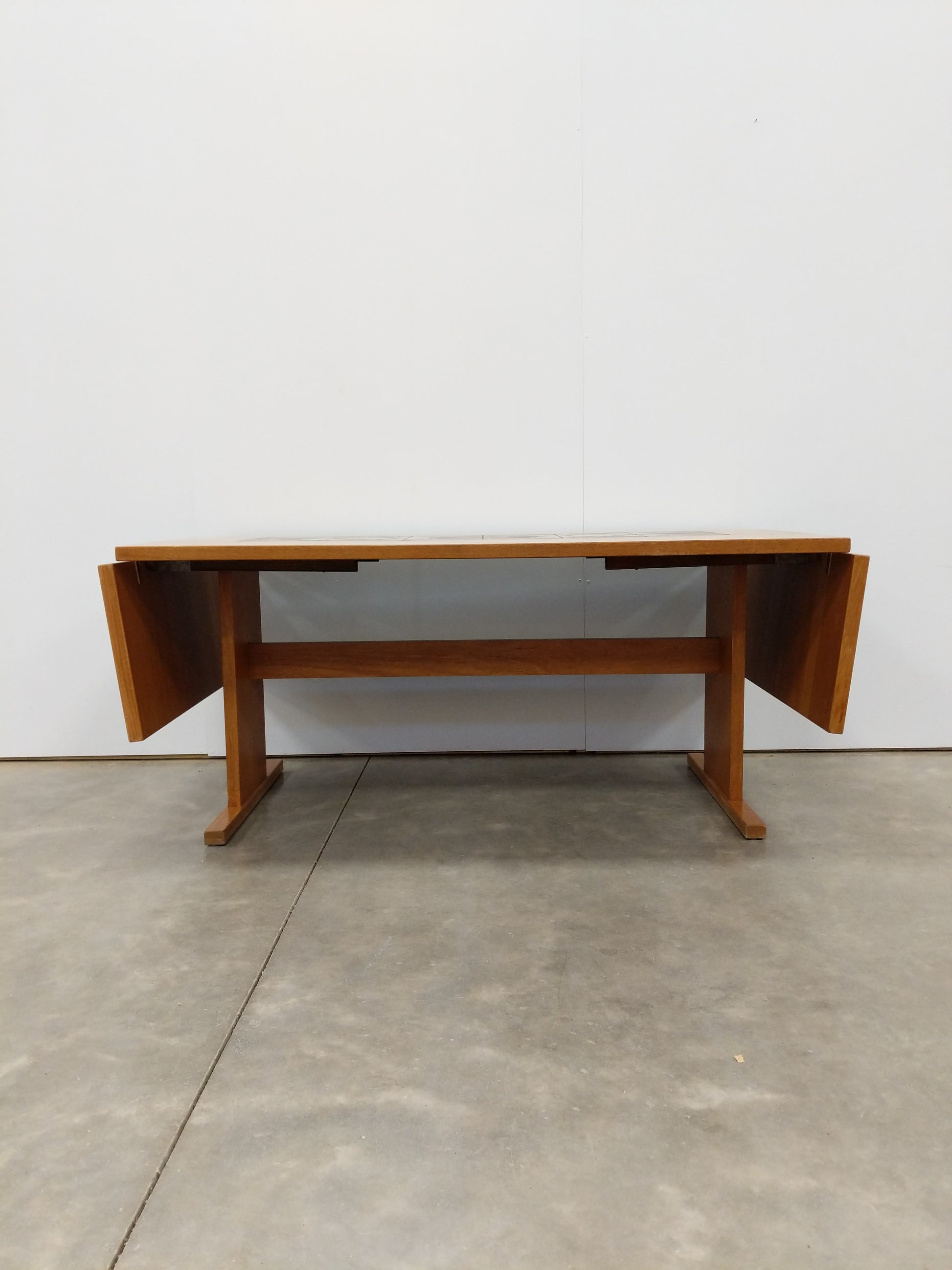 Authentic vintage mid century Danish / Scandinavian Modern teak and tile extendable dining table with 2 removable drop leaves.