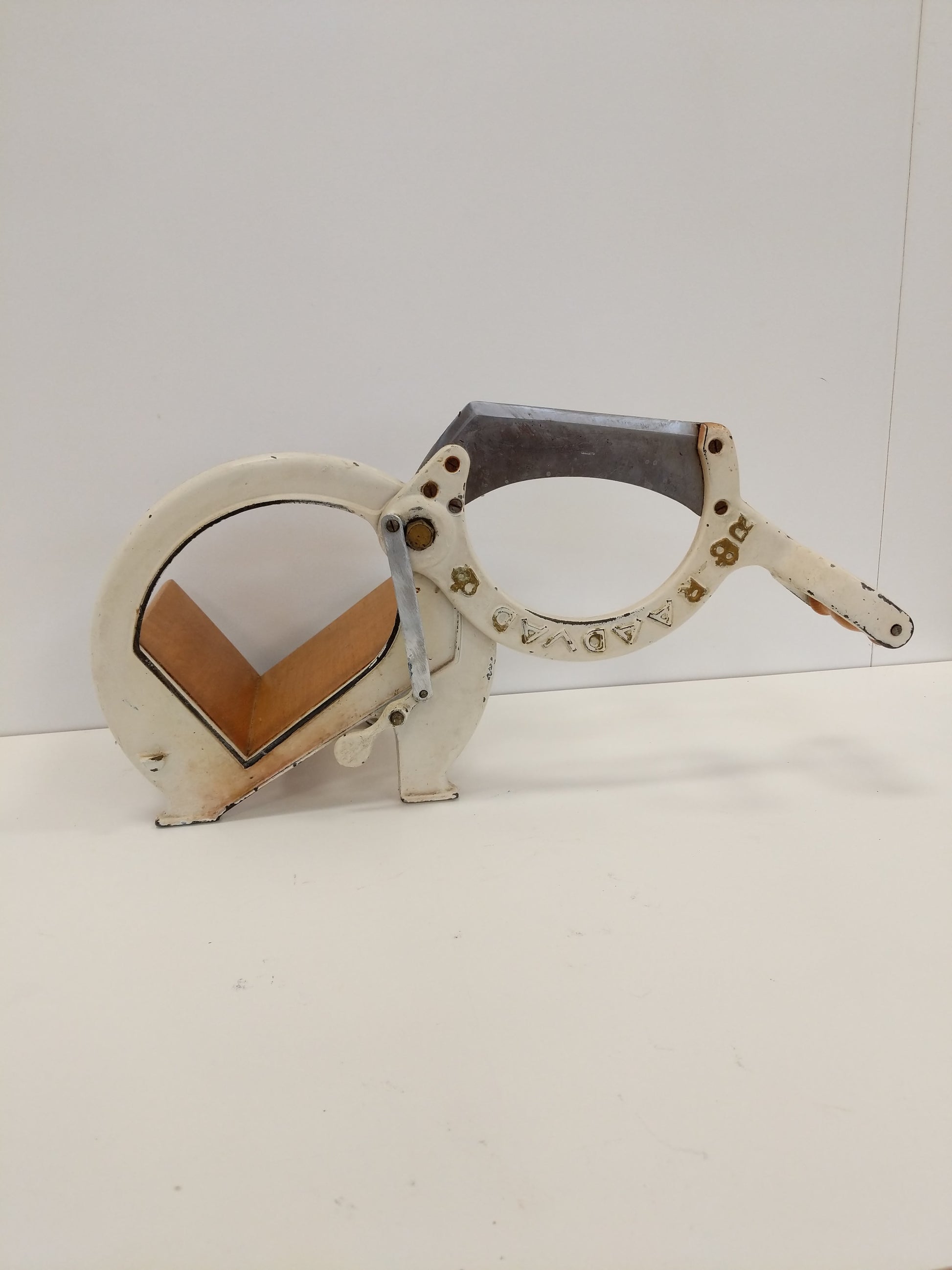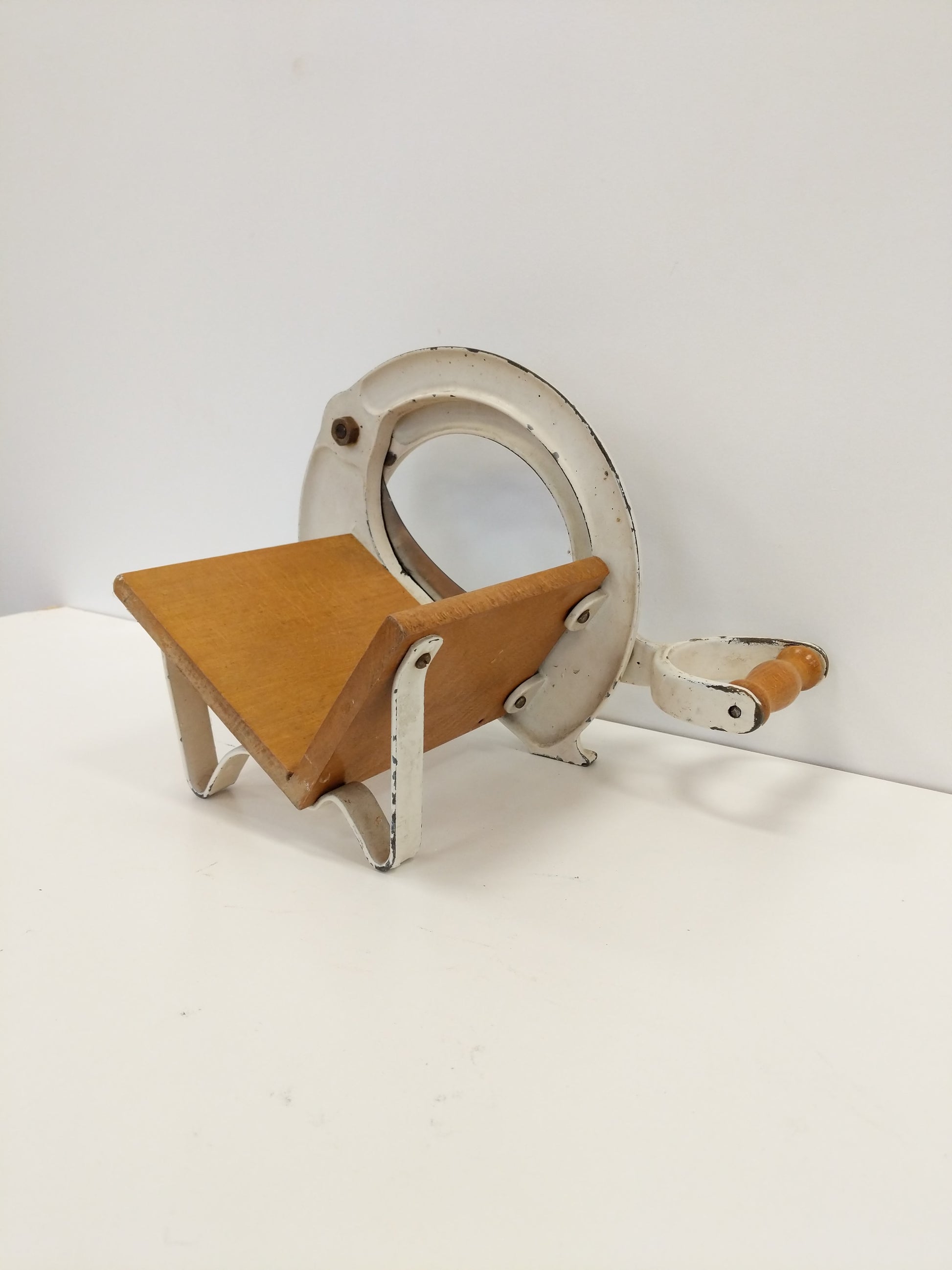 Authentic vintage Danish bread slicer / guillotine in white.