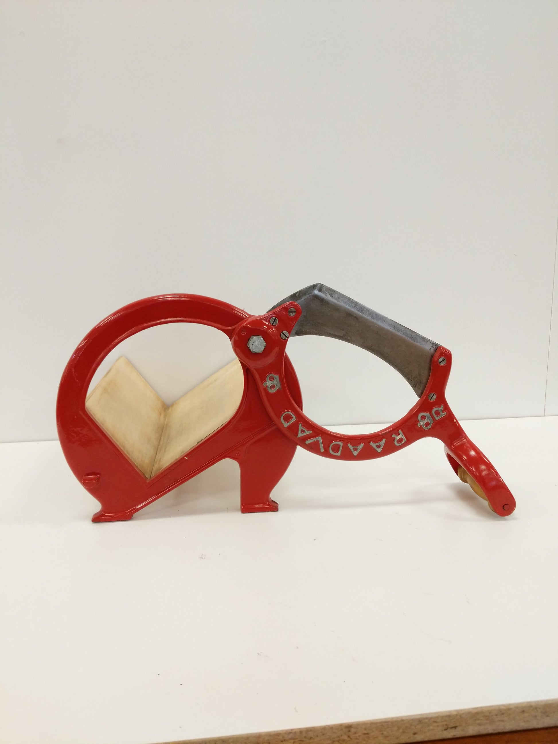 Authentic vintage Danish bread slicer / guillotine in repainted red with silver lettering.
