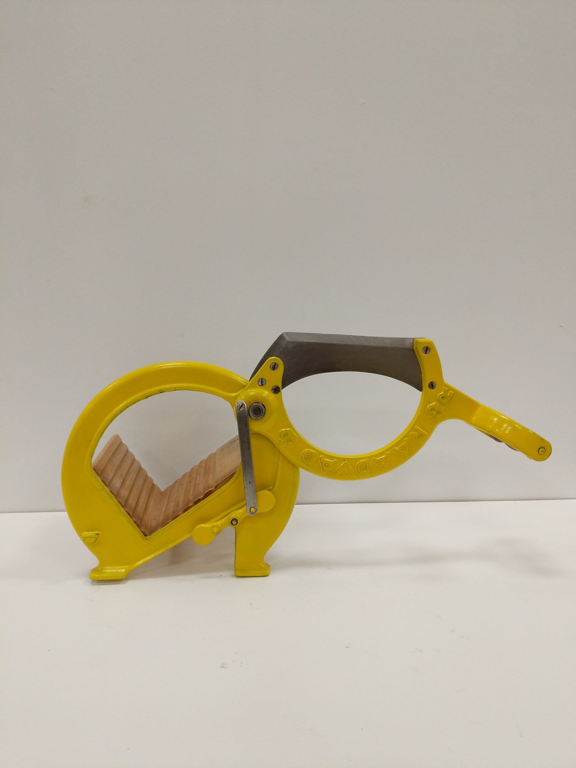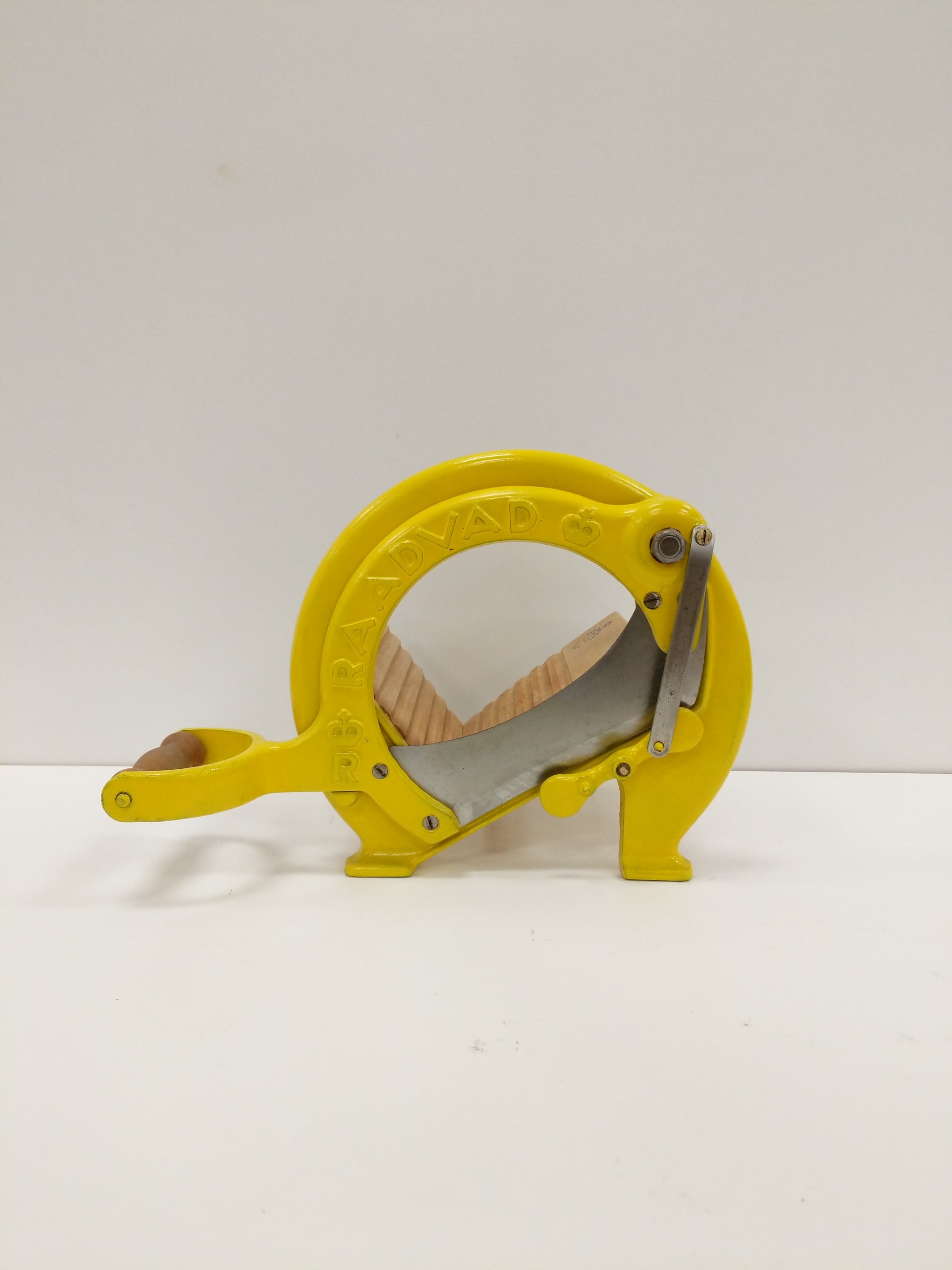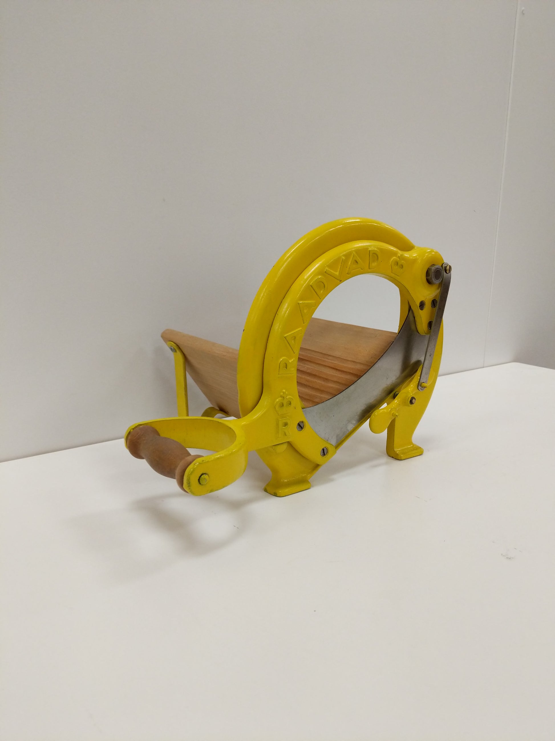 Authentic vintage Danish bread slicer / guillotine in yellow.
