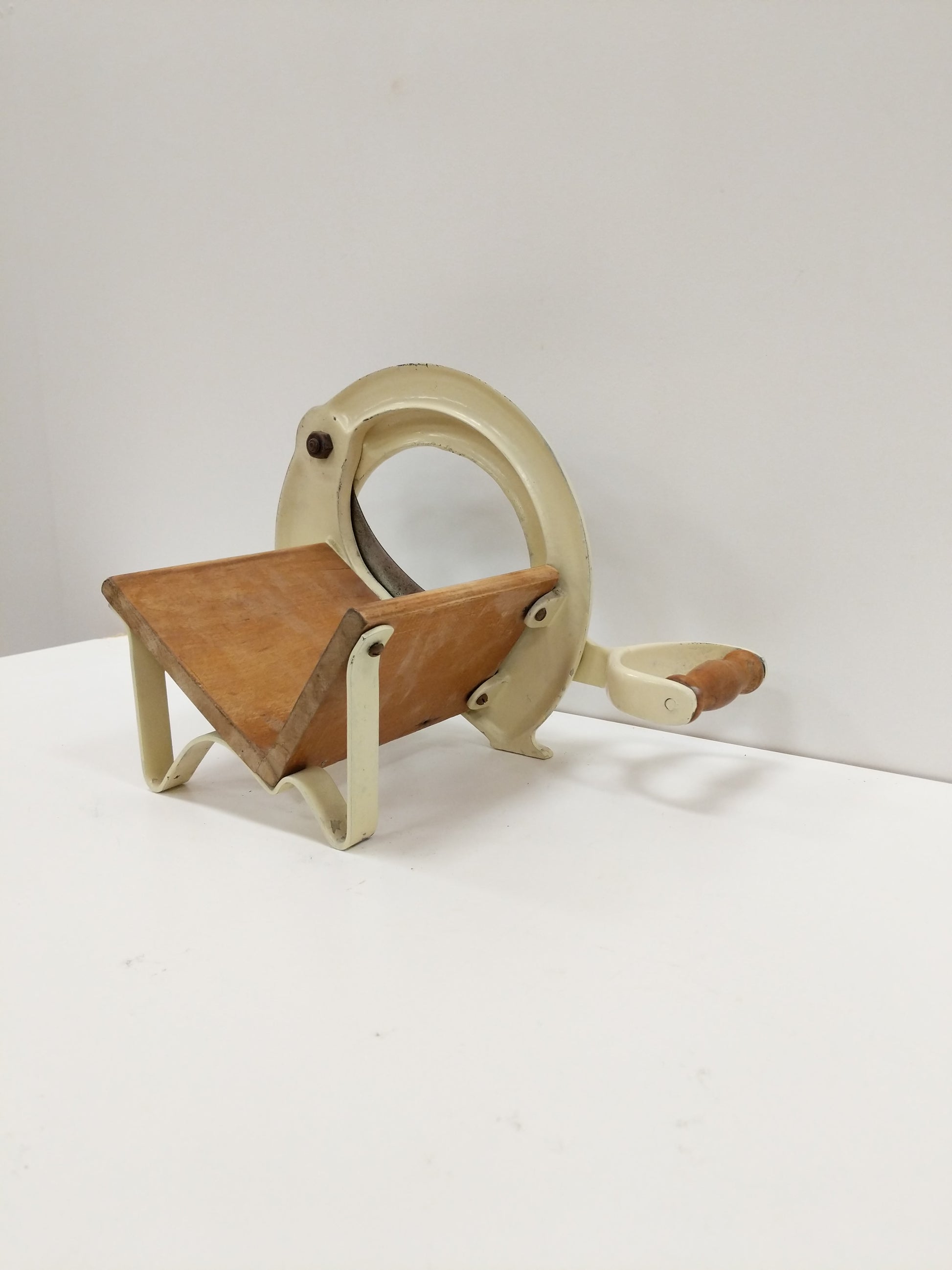 Authentic vintage Danish bread slicer / guillotine in off-white.