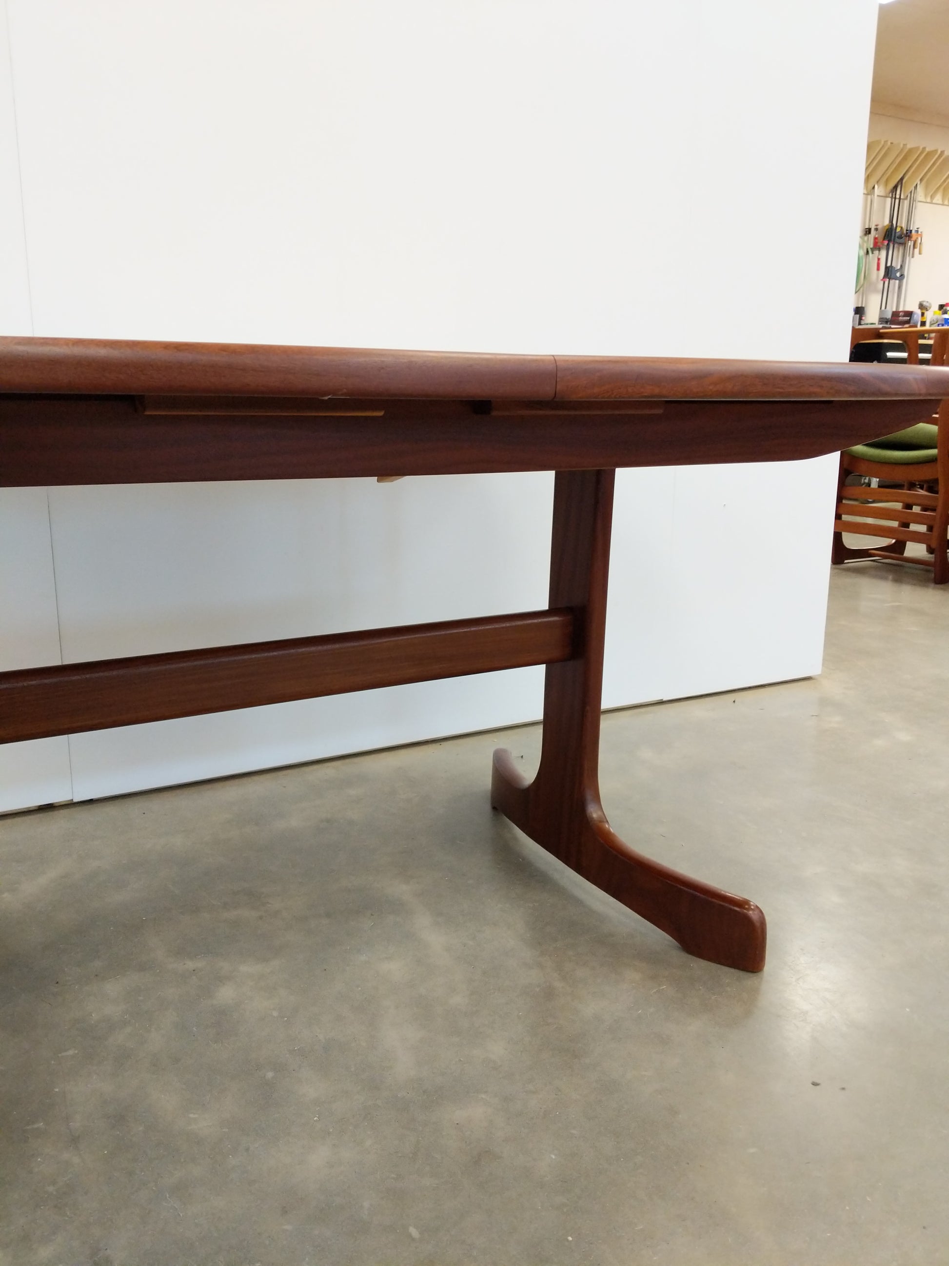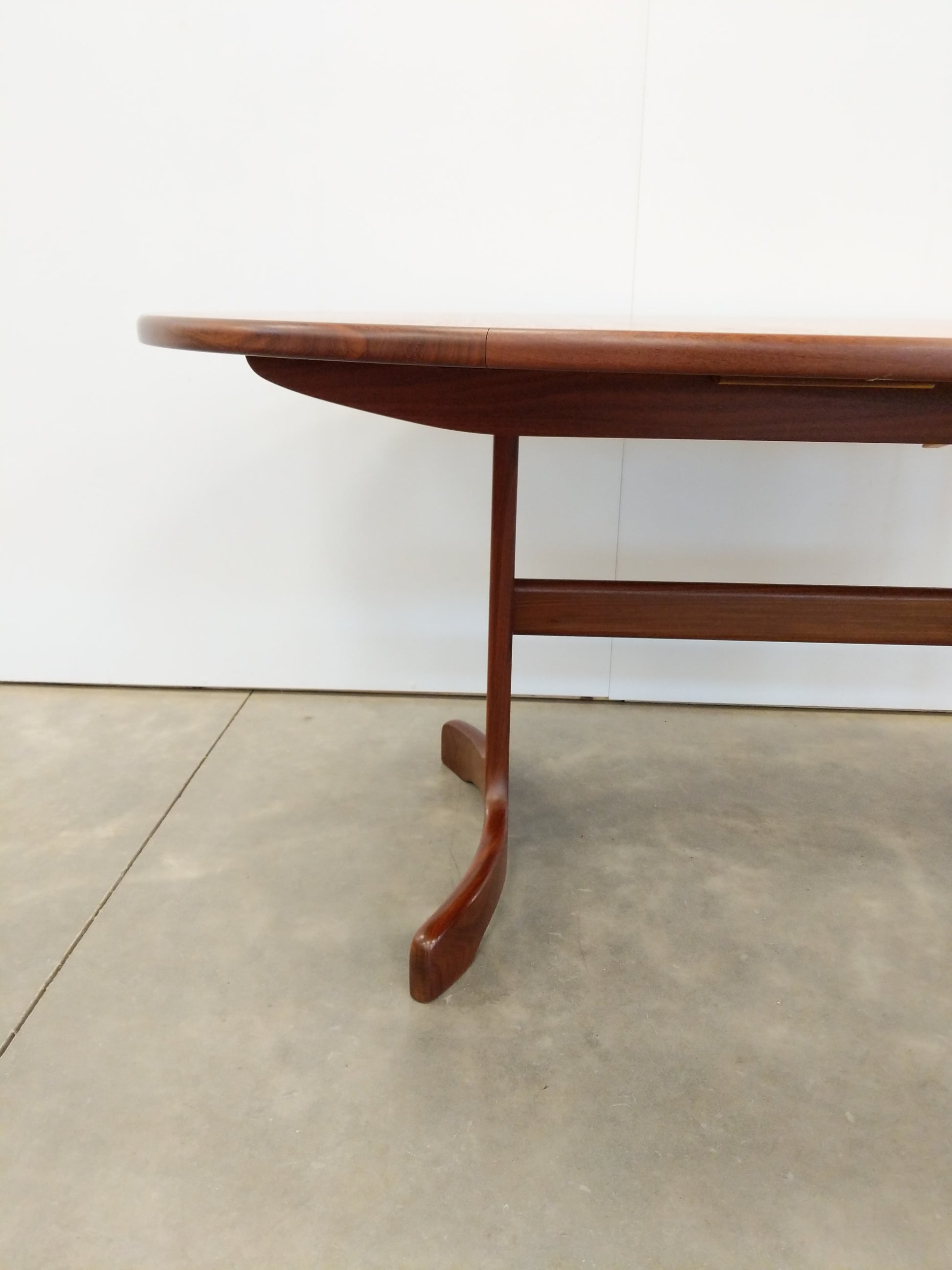 Authentic vintage mid century modern teak extendable dining table with 1 built-in leaf.