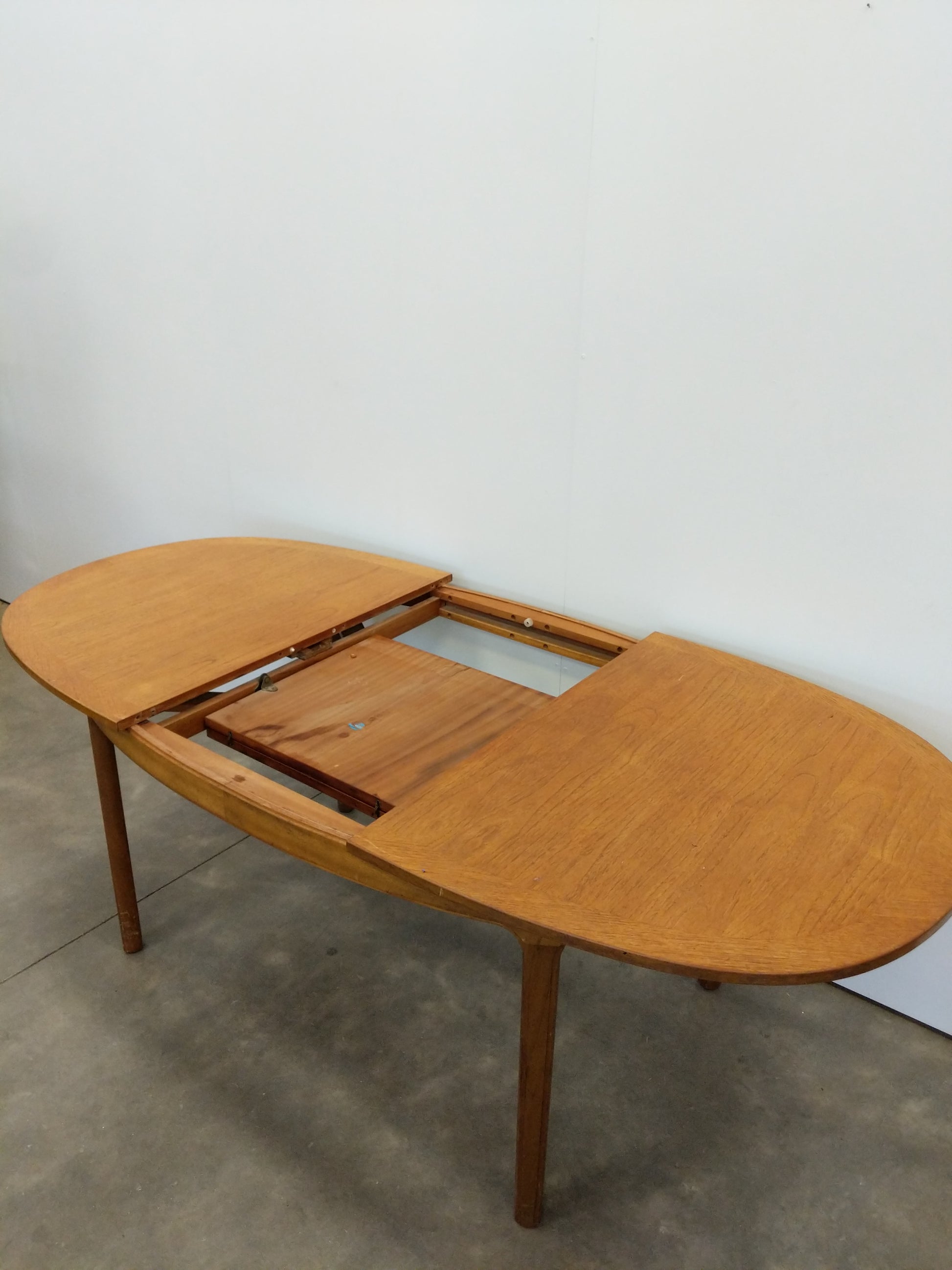 Authentic vintage mid century modern teak extendable dining table with 1 built-in leaf.