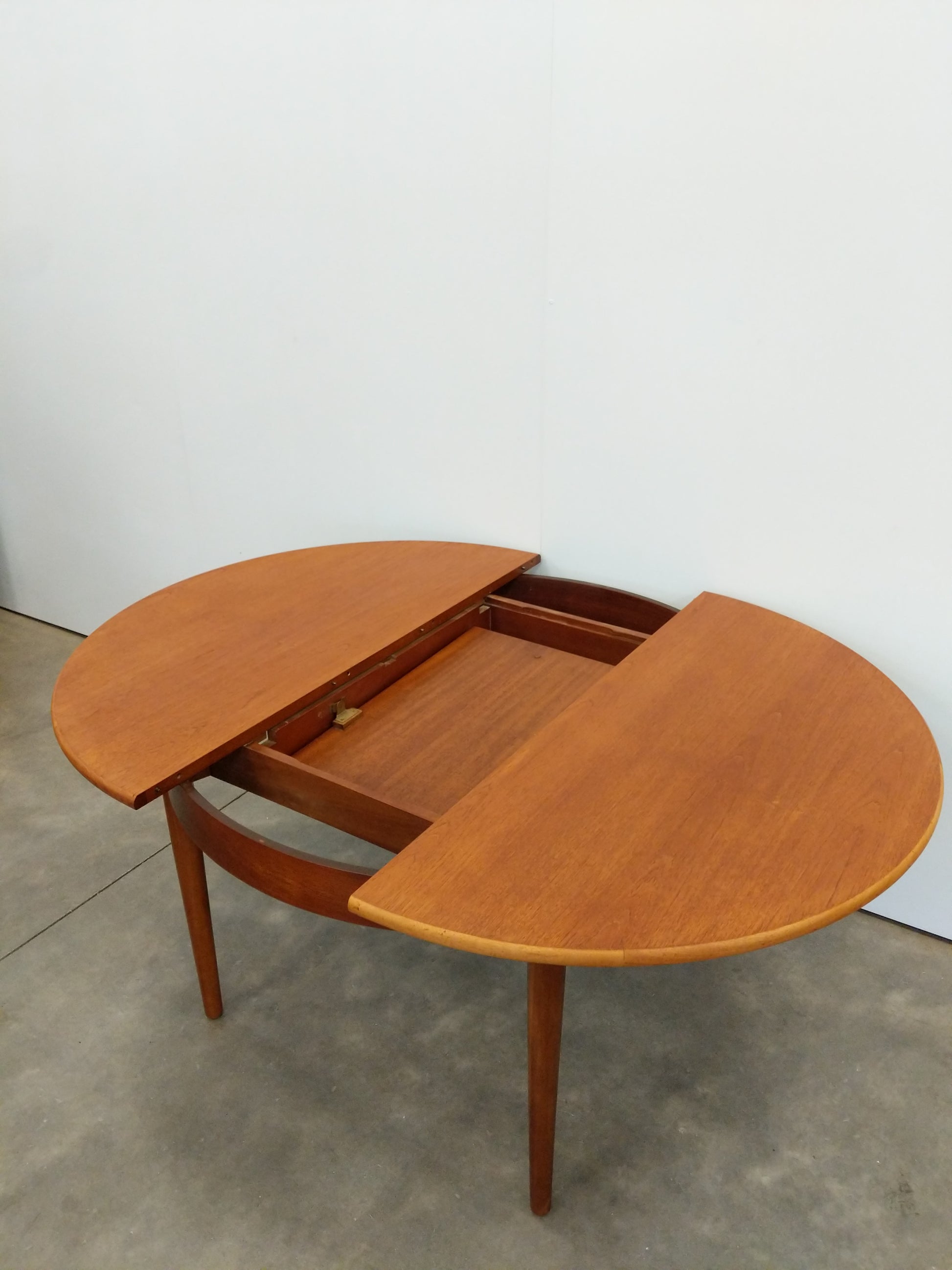 Authentic vintage mid century modern teak extendable dining table with 1 built-in leaf.